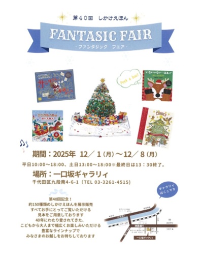 | 会期: 2025年12月1日(月)~12月8日(月) 時間: 11:00 ~18:00 (土日は13:00 ~17:00 最終日は15時まで) 主催: 大日本絵画 毎年恒例のしかけ絵本展。子供から大人まで大人気! 飛び出すだけでなく、音が鳴ったり光ったり、 お部屋に飾ったりと様々な楽しみ方ができる しかけ本約150種類をお手に取ってご覧頂けます。 |